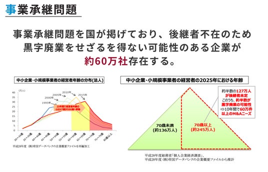 M&A という言葉からは企業同士が何億円という金額で企業の売買行うといったイメージをお持ちの方もいらっしゃるものと思いますが、実はM&A は個人の方でも行うことが可能です。世の中には黒字経営で業績は安定しているものの、後継者がいなくて困っているという企業は数多あります。また、既存事業ではなく新規事業に力を注ぎたいといった意向を持つ経営者の方もいらっしゃいます。後継者不足によって黒字廃業せざるを得ない可能性のある企業は日本国内だけでも約 60 万社存在していると言われています。そこでこの度、当社が事業としてスタートしたのが、独立したい個人と事業承継したい企業とのマッチングを行い、事業承継して頂く「個人M&A」です。「個人M&A」は、様々な理由により企業を手離したいと考えている経営者と、独立したいものの様々なリスクを考え、一歩踏み出せない個人の双方にとってメリットのあるスキームとなっています。