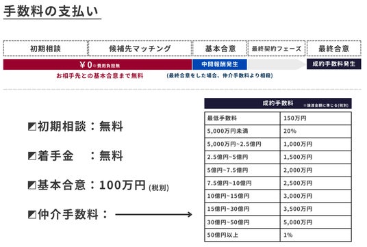 NEXIA PARTNERSでは「個人M&A」をされたお客様に対して、買収後の事業運営も弊社が伴走型で一緒に収益を上げるお手伝いをさせて頂きます。そのため、初めて事業を運営される方でも安心して経営を行うことができることも弊社サービスの強みとなっており、お客様からお喜びの声も多数頂戴しております。尚、初期相談や候補先企業とのマッチングなど、基本合意に至るまでの過程では費用は発生いたしませんので、お気軽にご相談ください。