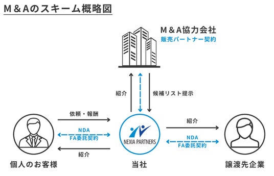 NEXIA PARTNERSの「個人M&A仲介」では、個人のお客様からのご依頼に基づき、パートナーであるM&A協力会社と連携し、候補となる企業のリストをご提示させていただきます。その後、個人のお客様、企業側双方とNDA契約、FA契約を締結させていただき、M&Aの基本合意、最終合意に至るまでフォローをさせていただきます。
