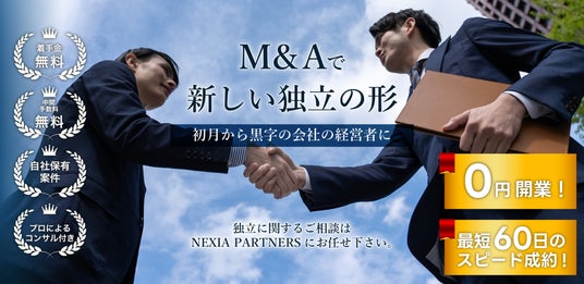 M&A仲介事業等を行う株式会社NEXIA PARTNERS(代表取締役:大塚 拓也、本社:大阪府大阪市)は、個人の事業買収を仲介する「個人M&A仲介事業」を2024年11月より本格的にスタート致します