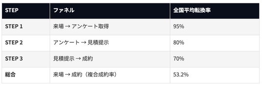 来店100組のうち53組が成約する--これがPSLが導く全国平均の構造です。コレツカはこの構造を可視化し、「どこに・いくらの機会損失があるか」を金額換算でAIが自動診断します。