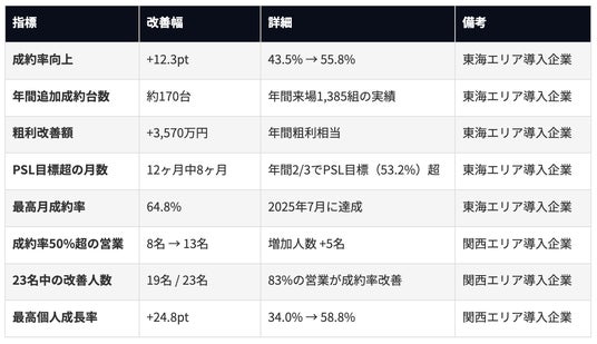 すでに導入企業において成約率43.5%→55.8%(+12.3ポイント改善)、年間粗利換算で約3,570万円相当の収益向上効果が確認されています。