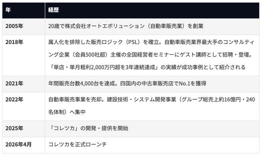 コレツカは、20歳で中古車販売店を起業し、四国内No.1(年間4,000台)に育て上げた青野聡太代表が、自らの現場経験とノウハウを徹底的に言語化・科学化することで生み出したサービスです。