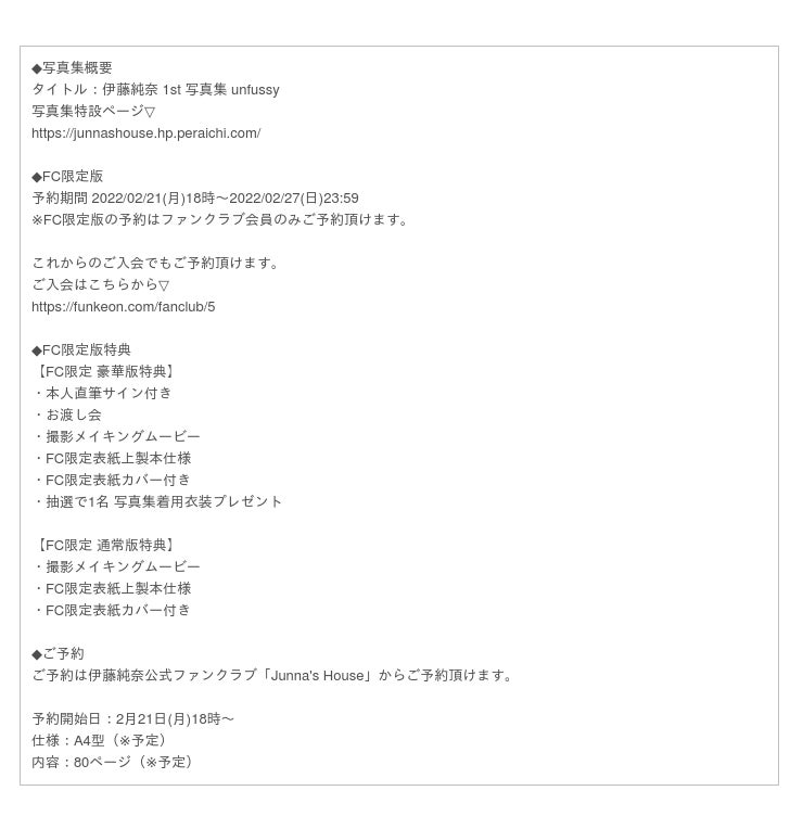 伊藤純奈、初の写真集を自身のファンクラブ「Junna's House」限定版を2022/2/21(月)に発売する事が決定した。