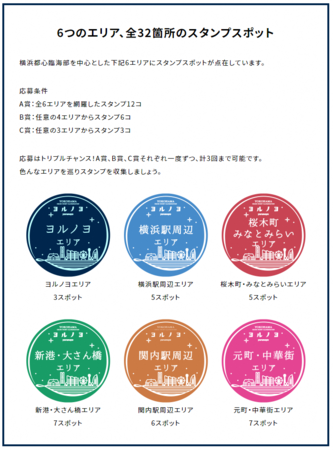 ヨルノヨの会場及び横浜都心臨海部のイルミネーションがスタンプのスポットとなっており、全部で6エリアに分かれています。