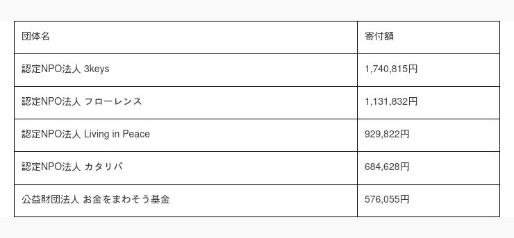 本ポイントプログラムの寄付先は日本において深刻化している子供、シングルマザー、教育問題の解決に取り組んでいる認定NPO法人などの団体が対象です。2022年度は社会貢献ポイントプログラムに5団体が参加、それぞれの団体に以下の寄付が行われました。