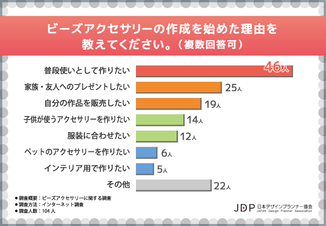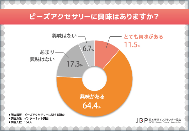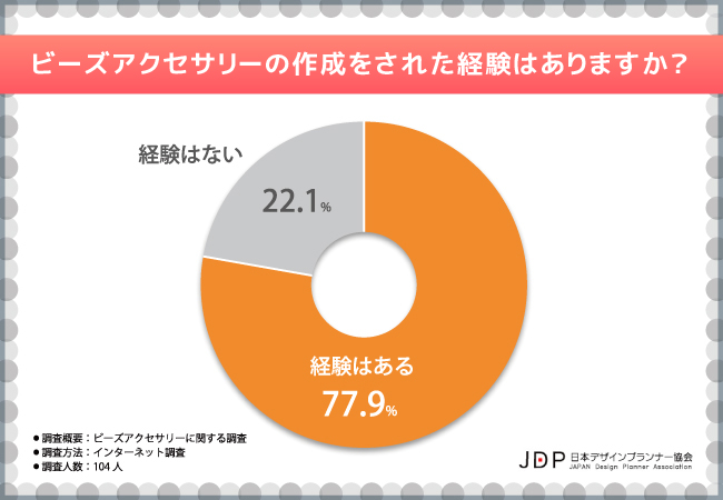 そこで今回、ビーズアクセサリーデザイナー認定試験(https://www.designshikaku.net/handmade/beads/)を主催する日本デザインプランナー協会(https://www.designshikaku.net/)は、全国の男女104名を対象に「ビーズアクセサリー」に関するアンケートを実施しました。
