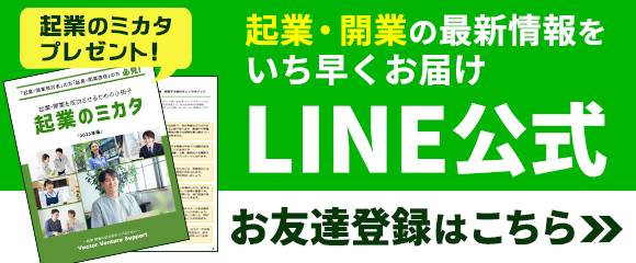 LINE公式『Vectorベンチャーサポート』では、起業や開業に関するノウハウ、補助金・助成金や資金調達、会社設立についてなどあらゆるジャンルの最新情報をお届けします。有益な情報をお届けし、起業家の成功率向上に貢献してまいります。