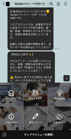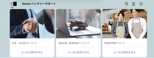 起業・開業時に不安を抱く方は非常に多いです。LINE公式『Vectorベンチャーサポート』では、会社設立、創業融資、飲食店開業などの起業・開業に関わる60以上のQ&Aをご用意しております。起業家がよく悩んでいる質問に対する回答をLINE公式『Vectorベンチャーサポート』から時間・場所を問わず、いつでも確認することが出来ます。