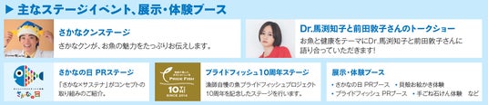 そのほか、さかなクンステージやDr.馬渕知子と前田敦子さんの栄養と健康トークショー等を実施します。また、貝殻お絵描きや鮮魚タッチ等の体験・展示ブースや被災地復興応援・地魚PRブース(JF福島漁連・JF全国漁青連他)にて漁師飯の販売等を予定しております。