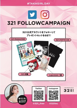 株式会社321公式Twitter、もしくは公式Instagramをフォローで321オリジナルグッズセットをプレゼント。ゆうこす出演時間には、撮影会への参加も可能に。