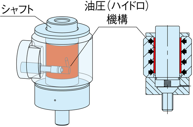 本体に油圧(ハイドロ)機構を内蔵することで保持力20kNを実現しました。内部にあるシャフト全体を油圧機構で保持するため、シャフト部の軸ブレがありません。(下の図の赤い部分が油圧機構。)