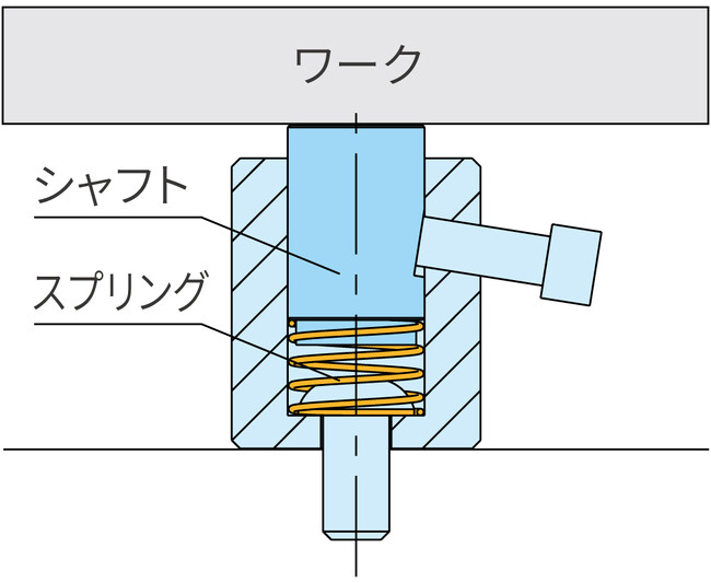 機械加工時に生じる振動で、加工対象物(ワーク)がビビったり、歪みが発生したりする場合があります。イマオコーポレーションの「ナチュラルサポーター」シリーズはワークの下に設置して、このようなビビリや歪みを防止する製品です。内蔵スプリングによりシャフトを持ち上げる力が発生し、シャフトは常にワークと密着した状態です。ワークの重みでシャフトの高さは自動的に決まり、シャフトをロックすることで、加工中のビビリを防止します。