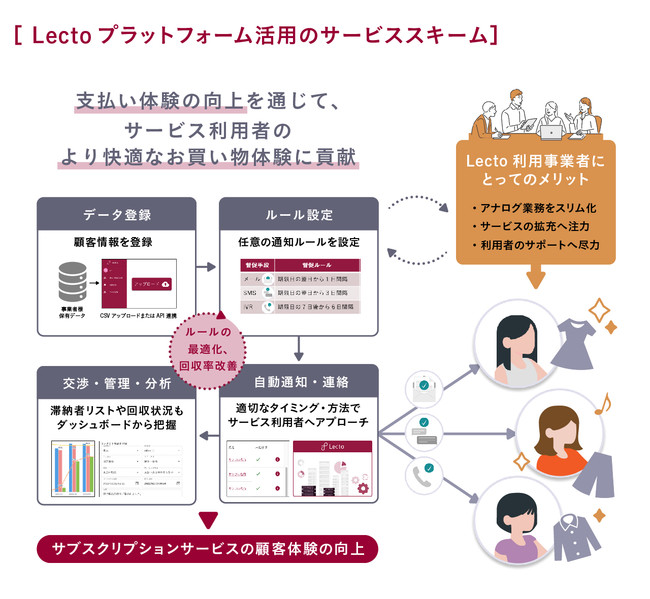債権管理業務のDXを推進しているLecto株式会社(本社:東京都渋谷区、代表取締役社長:小山 裕、以下 「Lecto」「当社」)は、2022年6月より、ファッション領域においてパーソナルスタイリングサービスを展開する株式会社DROBE(本社:東京都渋谷区、代表取締役CEO:山敷守、以下「DROBE」)と契約を締結し、Lecto独自のテクノロジーを活用した債権管理サービス「Lectoプラットフォーム」を提供開始したことをご報告いたします。LectoはDROBEが提供するパーソナルスタイリングサービス「DROBE(ドローブ)」における債権管理業務を効率化させることを通じて、ご利用ユーザーの支払い体験の向上をサポートし、より快適なお買い物験に貢献いたします。