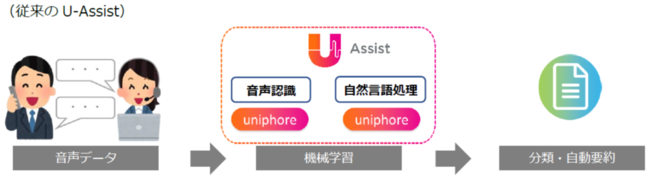 U-Assist は、通話内容全体をベースに分類・要約するのではなく、通話内容を分類するキーワードと、通話データの活用方法に応じた要約項目をあらかじめ設定し、ディープラーニング(深層学習)、機械学習を活用した言語理解モデルを用いることでリアルタイムの自動分類精度を高めることが可能です。従来のシステムでは、音声データのテキスト化、分類、要約の各プロセスが別システムとなっていましたが、U-Assistは音声データを投入するだけですべての処理を一元的に行うことが可能であり、維持・運用がしやすいこと、CRMや業務アプリケーションとリアルタイムに連携し、コミュニケーターの入力作業を自動化、簡素化することが可能である点が特長となります。