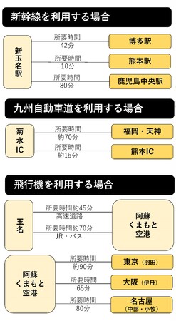 福岡都市圏と熊本都市圏の中間に位置する玉名市。九州自動車道インターチェンジが近いうえ、九州新幹線「新玉名駅」や在来線3駅があり、長洲町の有明フェリーにも近いんです!福岡空港や阿蘇くまもと空港、九州佐賀国際空港なども利用しやすく、関西・関東へのアクセスも良好。