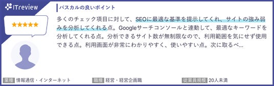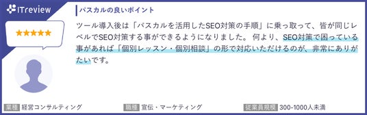 ITreviewにて、パスカルを実際に利用いただいているお客様よりたくさんのお声をいただいております。お客様からは「初心者でも使いやすい」「導入後のサポートが手厚い」などのコメントをいただきました。