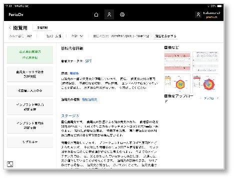 「PerioDx」が対象としたのは日本歯周病学会から発行された「歯周病の新分類への対応」(※)に基づく歯周病診断(以下、新分類診断)です。新分類診断は、患者一人一人に合わせた治療を可能にし、リスクや長期的な予後の予測も可能になるなど、より適切で効果的な歯周治療を可能にするとされていますが、反面、非常に複雑かつ煩雑で診断に時間がかかるため、実際の臨床で活用するのが極めて難しい状況にありました。その課題を解決するために開発したのが、「PerioDx」の歯周病診断支援機能です。口腔内の状態、歯周検査結果、いくつかの問診内容を入力するだけで自動的にステージ・グレードなどの結果・コメントが表示され、歯科医師が承認すれば診断結果が確定でき、新分類診断に慣れた歯科医師でも通常20分以上かかるところ、わずか8分程度で診断できるようになります。くわえて、診断結果はデータ出力可能で、患者とのコミュニケーション・動機付けツールとして活用できることも特徴です。