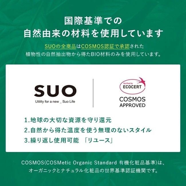 SUOクールアイテムは、昨今問題になっている地球環境への配慮としてサスティナブルな素材を厳選し使用する取り組みを行っております。