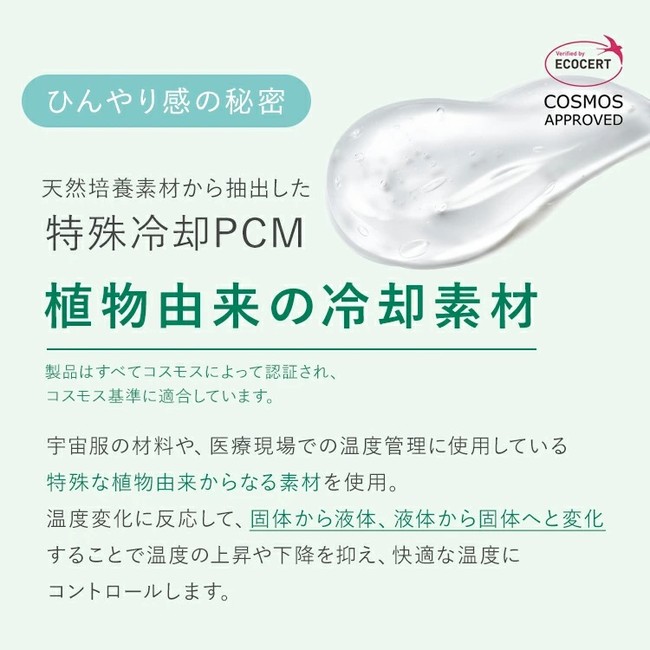 ひんやりクールな SUO リングは植物由来の特殊冷却素材PCM(Phase Change Material:相交換物質)という素材を応用して開発したプロダクトです。熱を吸収すると液体に、熱を放熱すると固体へと変化。SUO リングは28℃の気温でPCM素材が変化するように成分を調整し、一般家庭でもお使いいただけやすい温度や性能に設計しています。