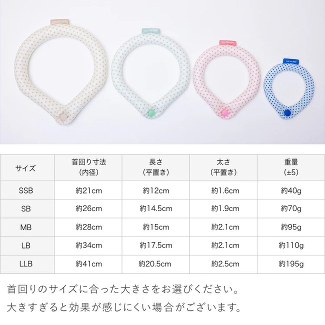 わんちゃんの首元にフィットするようにデザインされ、5種類のサイズをご用意しています。かわいい星柄でカラーも豊富。この夏はぜひ、進化したクールリングで暑さからわんちゃんを守りましょう。