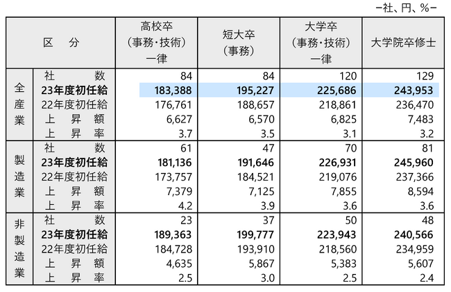 2023年度の賃金見直しによって確定された2023年4月入社者の決定初任給(学歴別)。なお、初任給は原則として時間外手当と通勤手当を除く、諸手当込みの所定内賃金である。