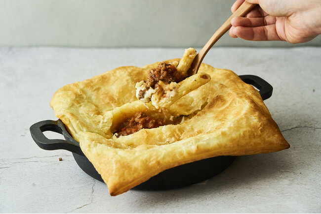 また、FOREST GREEN PASTA&BAKEでは、パスタ全面にパイをのせてオーブンで焼いた、パイ焼きパスタも新登場!パイの中にはとろとろマッシュポテトとボロネーゼ、ペンネの相性がたまらない美味しさ。2種類のチーズを合わせて味わいに深みを出しています。とろとろマッシュポテトとボロネーゼのペンネ 1800円(税込1980円)