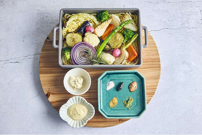 になりました!国産野菜、産地にこだわった13種類のグリル野菜をのせて、野菜をより楽しんでいただけるオリジナルのバーニャカウダソース、ハーブのクリームチーズ、野菜の旨味を引き出すお塩やハリッサ、タプナードペーストを添えて、食べるごとに味変も楽しめます。