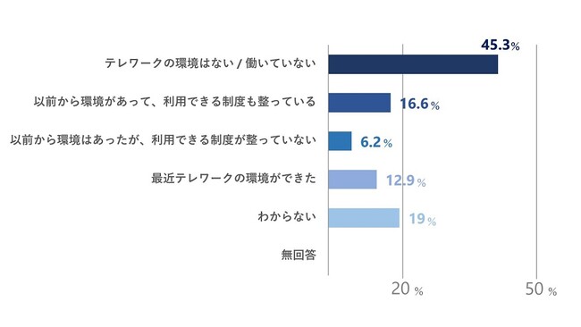 テレワークの環境はない/働いていない」の回答が45.3%となり、「以前から環境があって、利用できる制度も整っている」の回答が16.6%、「以前から環境はあったが、利用できる制度が整っていない」の回答が6.2%、「最近テレワークの環境ができた」の回答が12.9%、「わからない」の回答が19.0%でした。