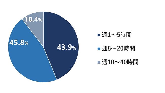 Q3.で「副業をしたいと思う」「副業をしている」と回答した人に、副業に取り組める(取り組んでいる)時間を聞くと、「週5~20時間」が最も多く45.8%、「週1~5時間」が43.9%、「週10~40時間」と回答した人が10.4%でした。