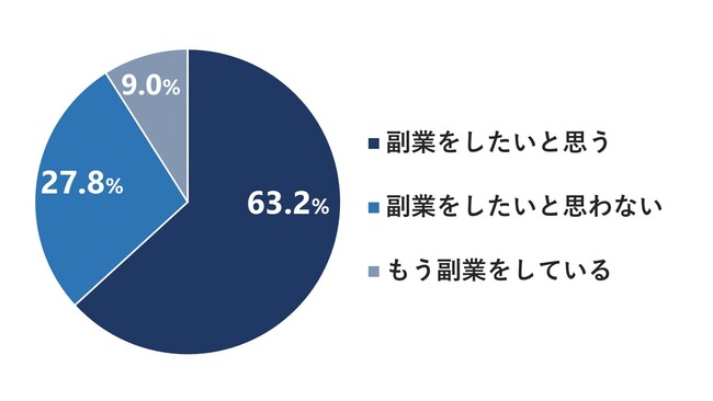 「副業したいと思う」と答えた人が63.2%で、もう「副業している」と答えた人が9.0%、「副業したいと思わない」と答えた人が27.8%でした。