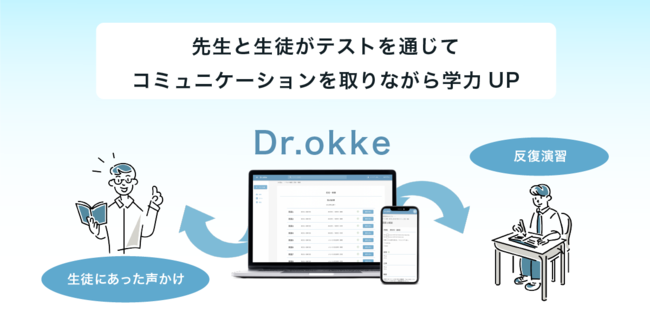 そこで我々は、スキマ時間で簡単にテストを実施できて、適切な声掛けを行うことにより、生徒の能動的な学びを活性化できる、Dr.okkeというツールを作っております。