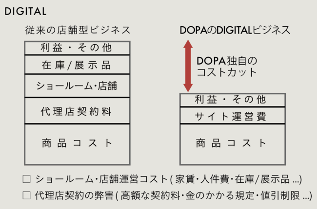 DOPAは<DIGITAL>を使った最大限の効率化と、国境を超えた<DIRECT>インポートビジネスを選択したことで、従来型ビジネスでは不可能だった圧倒的なコスト圧縮を実現し、商品を“適正な価格”でご提案しております。