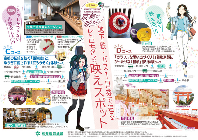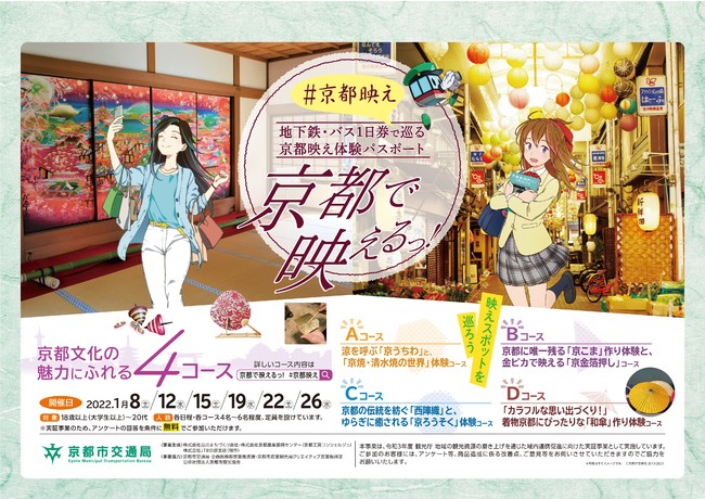 また、若い方々に興味を持ってもらえるような文化体験や伝統工房体験をコンテンツ化、沿線の映えスポットとセットでお得に周遊できるような周遊券「京都で映えるっ! #京都映え ~地下鉄・バス1日券で巡る京都映え体験パスポート~」を企画し、モニター体験会を実施します。