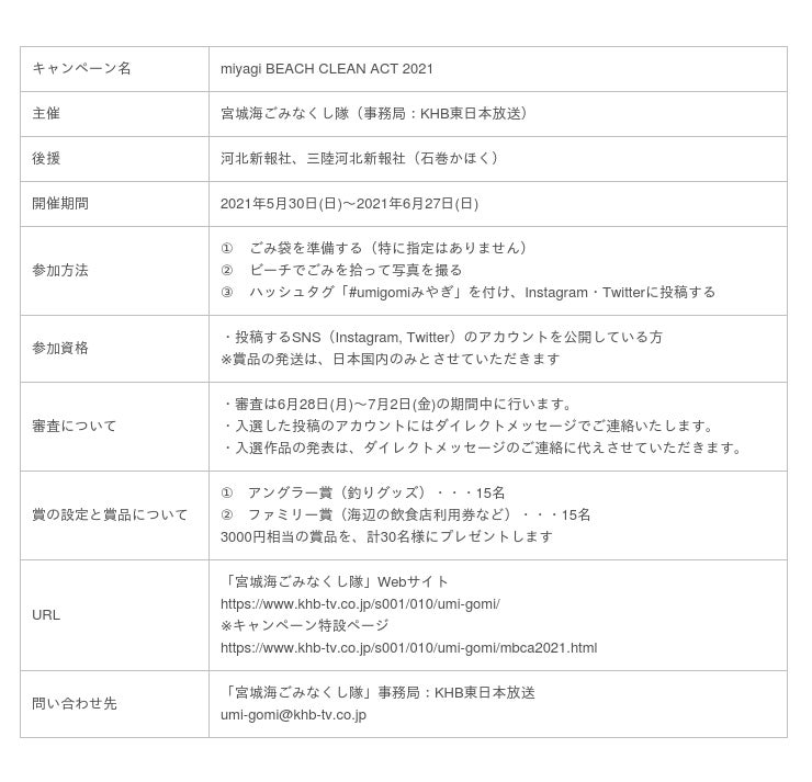 「宮城海ごみなくし隊」(事務局:KHB東日本放送)は、2021年5月30日~2021年6月27日に「miyagi BEACH CLEAN ACT 2021」を開催いたします。このキャンペーンは、日本財団が推進する海洋ごみ対策プロジェクト「海と日本プロジェクト・CHANGE FOR THE BLUE」の一環で開催するものです。