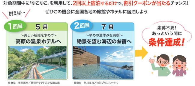 2020年に実施されたGoToトラベルキャンペーンにより多くのお客様にご旅行いただきましたが、同年12月には一斉中止となり、その後も再開されていません。そこで当社では、各県民割・GoToトラベルキャンペーン実施の有無に関わらず、お客様がご旅行をお楽しみいただく後押しとなるキャンペーンを開催します。ゆこゆこを利用して2回以上ご宿泊いただいた方は応募不要で抽選対象となり、1,500名様に最大5,000円引きの宿泊割引クーポンが当たります。