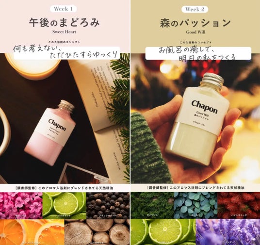 Chaponは「家族のクタクタ疲れを、一気に癒やしたい。」という当事者の想いから生まれた、身体の疲れや睡眠の質などの暮らしの悩みに寄り添ったオンライン販売の高級入浴剤ブランド。「週に一度の、ちょっとした贅沢。」というブランドコンセプトのもと、"疲れた心が笑顔に変わる体験" を追求し日々をもっと自分らしく過ごせるライフスタイルを提案しています。バスソルト初グッドデザイン賞受賞、Amazon・楽天 部門ランキング1位獲得。癒やしの香りに包み込まれて "ぽかぽかとろける新入浴体験" が話題。