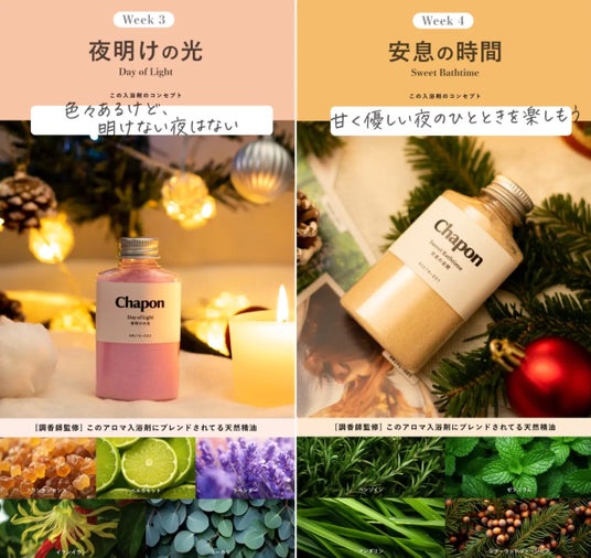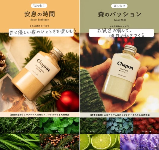 Chaponは「家族のクタクタ疲れを、一気に癒やしたい。」という当事者の想いから生まれた、身体の疲れや睡眠の質などの暮らしの悩みに寄り添ったオンライン販売の高級入浴剤ブランドです。Amazon・楽天の部門ランキング1位を獲得するなど、大切な人へのクリスマスギフトやお礼の品などで愛されるブランドへと成長しています。