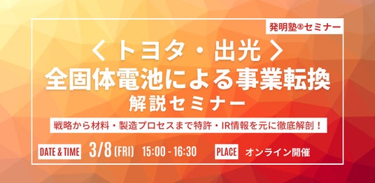 【3月8日オンライン開催】発明塾セミナー:トヨタ・出光は全固体電池を武器に事業転換をどう進めるか? ~両社の戦略から材料・製造プロセスまで特許・IR情報を元に徹底解剖!~