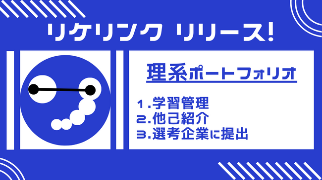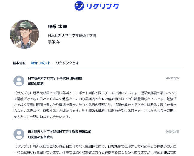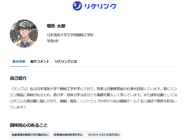 リケリンクの主目的は、日々の学びの質を向上させて効率的に管理するとともに、就職活動において学生独自の魅力や能力を引き出して伝えることです。理系としての専門性や身近な人の紹介コメントを通じて、履歴書だけでは表現し切れないポートフォリオが完成します。
