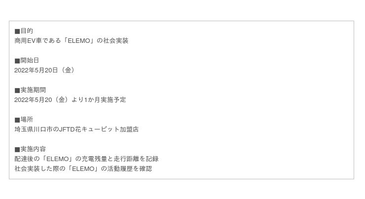 今回の実証実験は、お届け先に近い加盟店が新鮮なお花をお届けする生花通信配達システムを運用するJFTD花キューピットにご協力いただき実施致します。商用EV車である「ELEMO」の社会実装を目的に、2022年5月20日(金)より1か月間、 JFTD花キューピット加盟店の埼玉県川口市の店舗で、生花の配達車輛として使用していただきます。実験に使用する車輛は、ピックアップタイプの「ELEMO」の荷室に、スタンド花なども積み込める高さの幌架装を施しました。