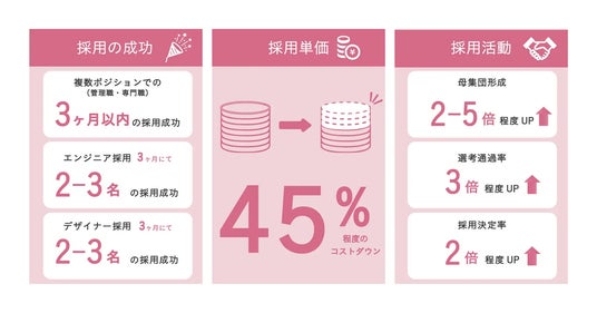 最大45%の採用単価削減、3カ月以内に複数ポジションの採用の成功、および母集団形成の最大5倍の向上など、採用戦略・採用広報活動・人事戦略において様々な成果を実現しています。