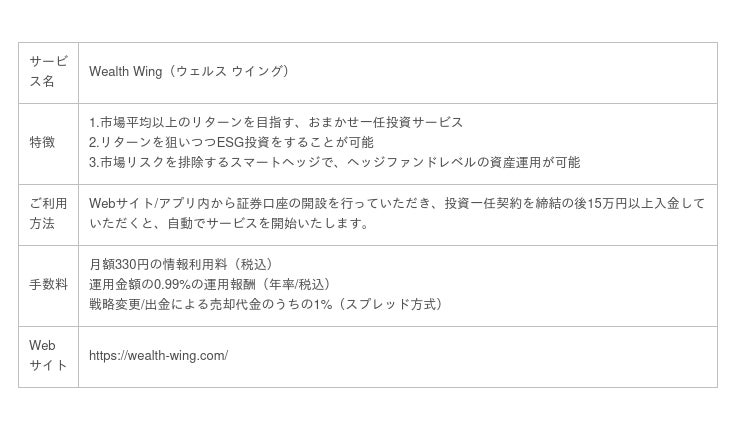 業務提携により、Innovation IFA Consultingは当社のお客様向けにスマートプラスが提供するアクティブなおまかせ一任投資サービスWealth Wingを提供してまいります。