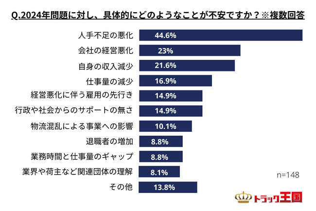 ・2024年問題に対する不安の具体的内容は「人手不足の悪化」が44.6%、次いで「会社の経営悪化」が23%、「自身の収入減少」が21.6%