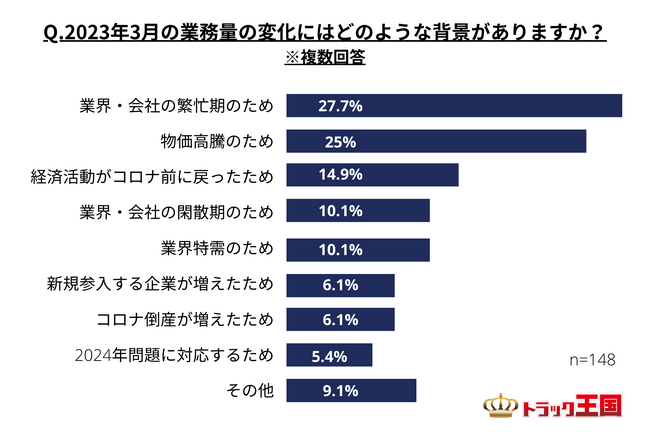 仕事量の変化の背景要因を問う設問に対しては、「繁忙期・閑散期」のほかに「経済活動がコロナ禍前に戻った」「物価高騰」が挙げられました。通常の季節要因のほかに、今年ならではの要因が挙げられていることがわかります。また、中にはわずかですが「2024年問題へ対応するため」との回答も挙がりました。