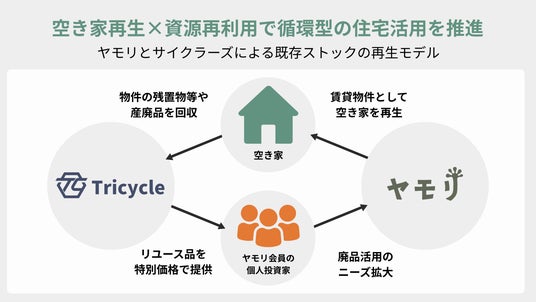 物件発掘や投資家・オーナー集客を担い、トライシクル側が残置物撤去、中古品回収、リフォーム、金属買取・廃棄対応、さらにリユース可能品の選別・回収までを一体で担うことで、空き家再生の初期工程を効率化する構想です。