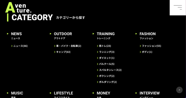 現在、Aventureで記事を公開している「アウトドア」「トレーニング」「ファッション」「音楽」「お金(資産形成・運用)」「ライフスタイル」の6カテゴリについて、ニュース配信をしていきます。