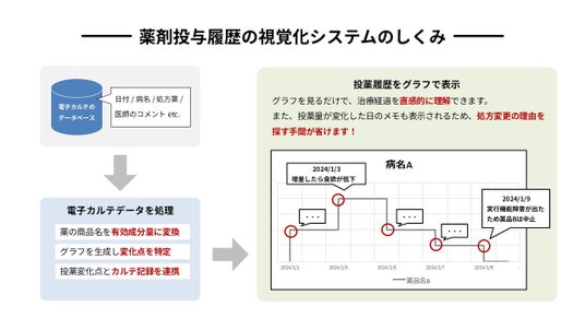 今回の技術は、こうした課題を解決するためのものです。患者に処方される薬の量は、治療経過に応じて調整されます。しかし、薬の量を変更した際に患者の症状がどのように変化したかを把握するには、電子カルテ内の膨大な診療記録の中から該当する記述を探し出す必要があり、医療者にとって大きな負担となっていました。特に、投与量の調整が複数回にわたる場合、「いつ、どの薬を、どれくらい変えた時に、何が起きたのか」 を追うことは難しく、治療判断や振り返りに時間がかかっていました。