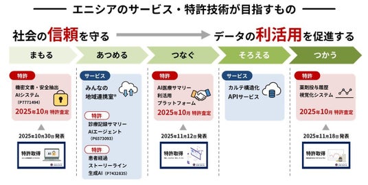 エニシアは、医療データが適切に活かされるまでの一連のプロセス全体を、特許技術とサービスの両面から段階的に支えています。
