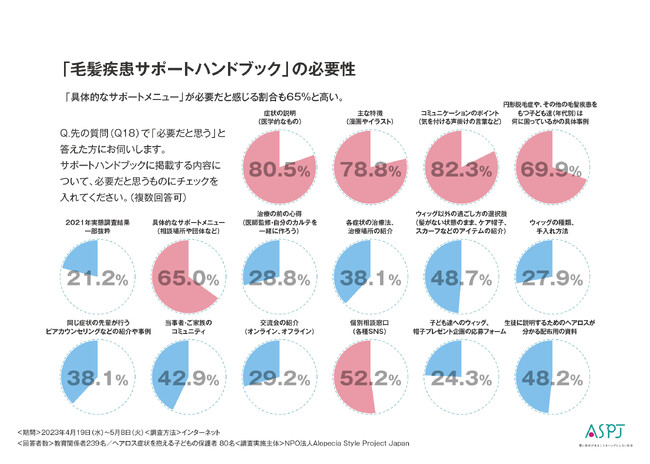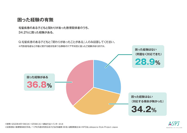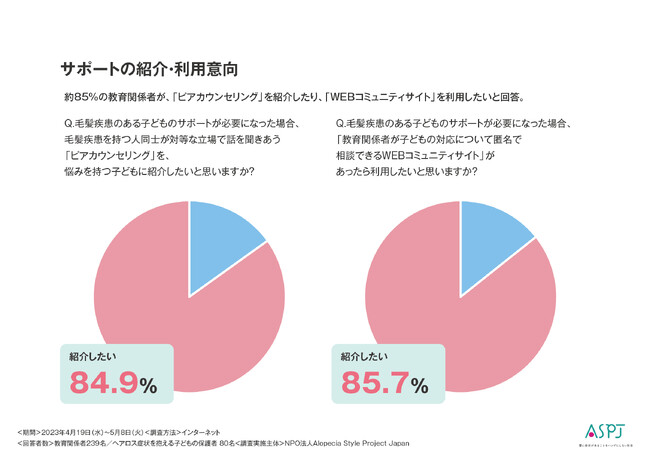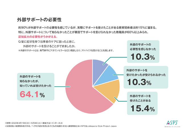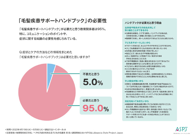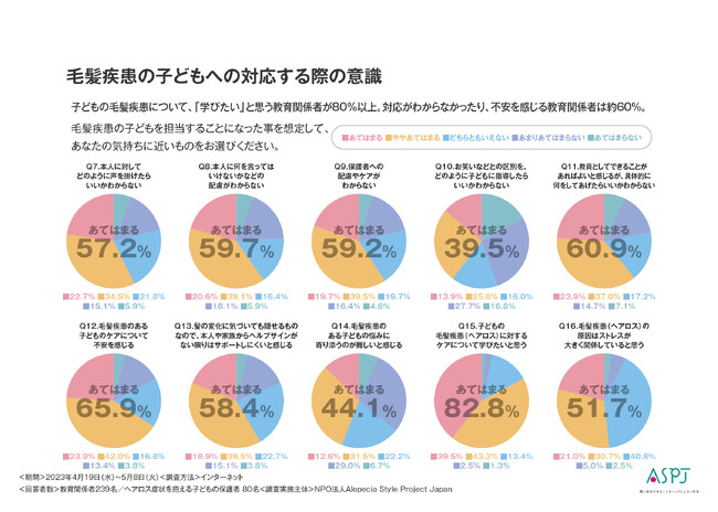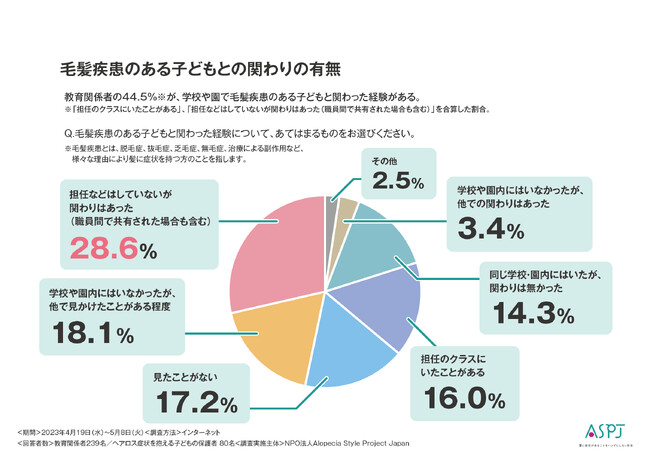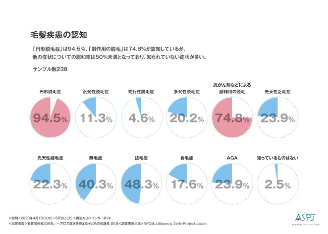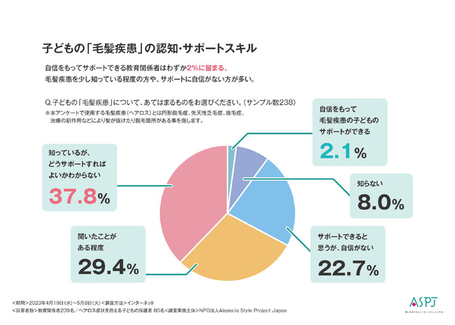 NPO法人Alopecia Style Project Japan(以下:NPO法人ASPJ)は2023年4月19日(水)~ 5月8日(火)まで毛髪疾患の子どもがいる保護者と、教育関連の仕事をしている方(現職の小学校教諭、中学校教諭、中学校教諭、保育士、幼稚園教諭、学童指導員など)への意識調査を実施しました。見た目にわかりづらく人に伝えづらい症状であることから認知度が進まない現状の中でも、毛髪疾患を抱える子ども達の周囲の環境について発表します。